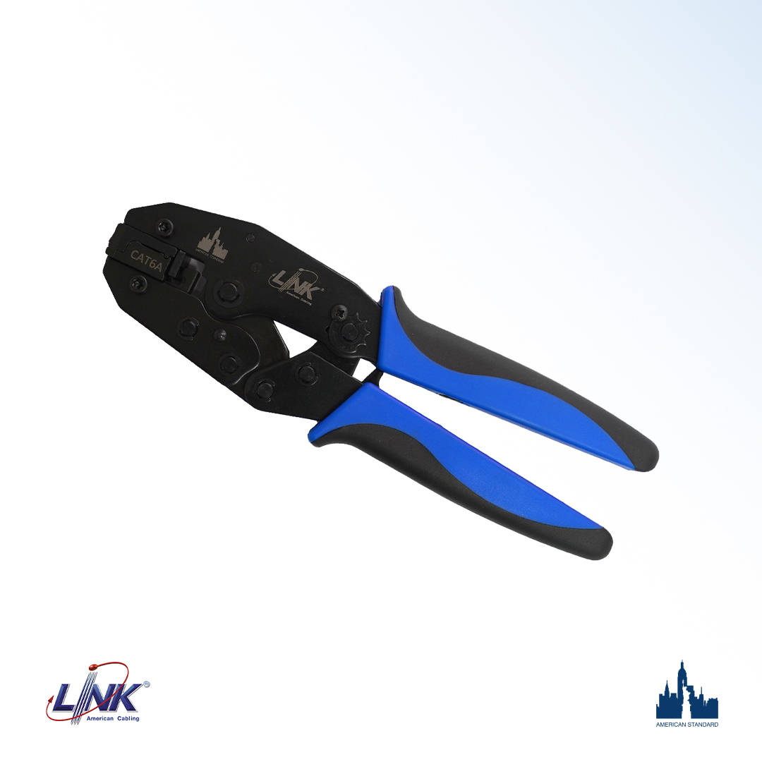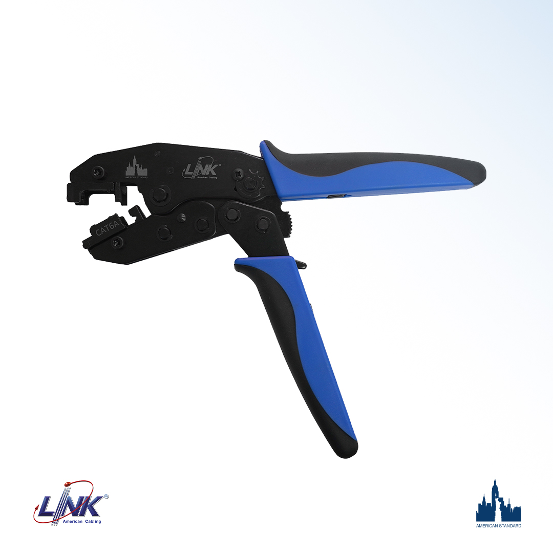 CRIMP TOOL for NEW SHIELD RJ45 GOLD 6A PLUG, Black & Blue design to crimp SHIELD CAT6A RJ45 PLUG. This tool is suitable for standard modular plugs without changing the modular die set and can complete work in one step Modular Holders are made of AL-Zn Alloy lightweight with PE grip together with a ratchet mechanism for easy use.